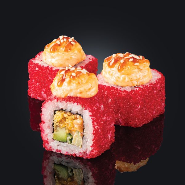хрустящий ролл: суси рис, ананас, манго, тигровая креветка в темпуре, сырный соус, стружка тунца