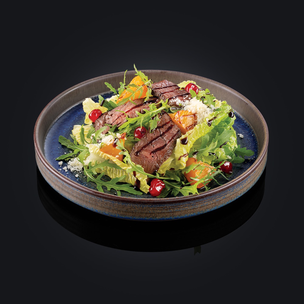 ростбиф из говядины, руккола, романо, карамелизированные вишня и тыква, пармезан, трюфельный бальзамик- крем