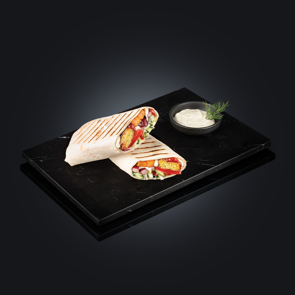 с бататом фри, красной фасолью, капустой, томатами, красным луком и огурцами. С томатным и чесночным соусами