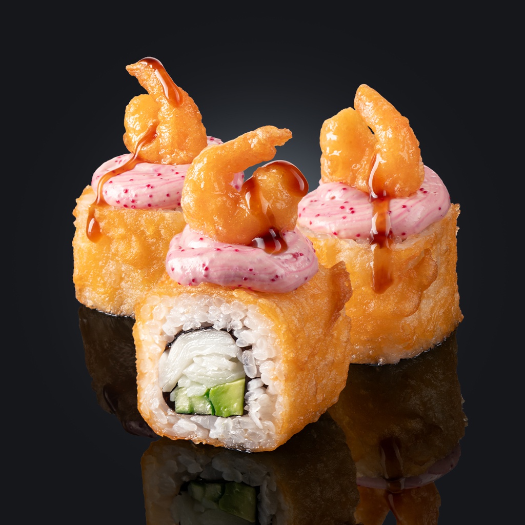 теплый ролл с магаданскими креветками в кляре на подушке из сырного крема с масаго и снежным крабом (5 шт.)